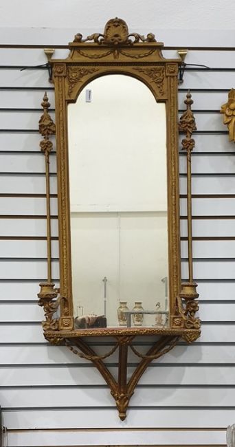 Long Adam's style wall mirror, pier glass with gilt-effect frame, two candleholders flanking with shelf under