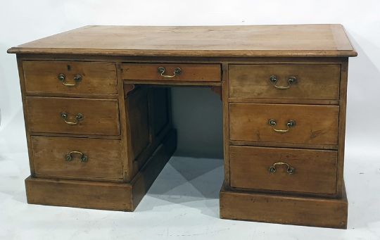 19th century pine partner's desk, the rectangular top with moulded edge, assorted drawers and cupboard doors, to plinth base, 152cm x 77.5cm