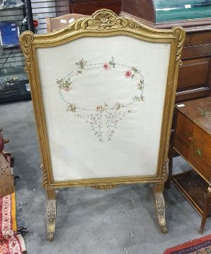 Giltwood firescreen with shell, floral and scroll pediment, inset with silk embroidered floral needlework panel, on carved foliate scroll supports, 61cm x 105cm