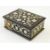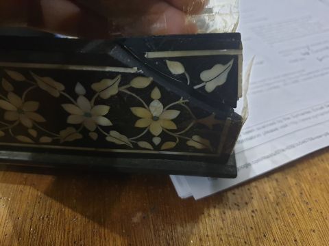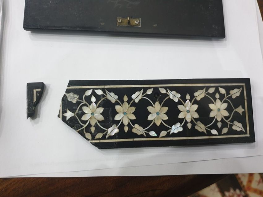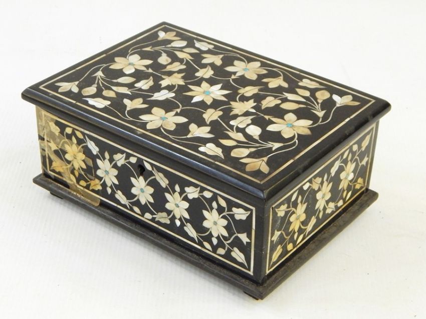 The box is broken across the front, with one missing hinge and one broken hinge, leading to the top being detached. All pieces of mother of pearl appear to be present. There are some chips to the box corners and edges.