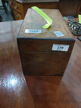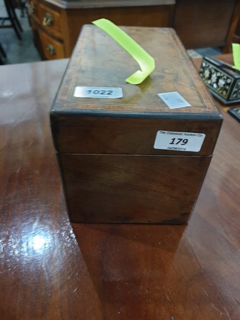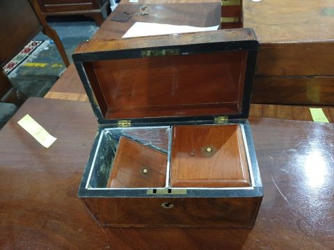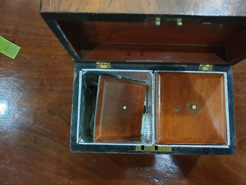 The caddy has been lined with silver coloured foil on the inside. There are some scratches and marks to the corners and edges and it is missing piece of the mother of pearl to the keyhole surround.