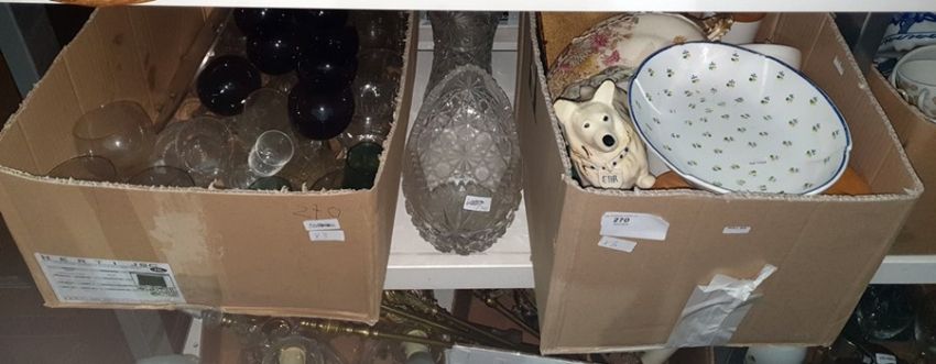 Four Portmeirion storage jars, a ceramic corgi money box, cut glass bowls, assorted glassware and other items (2 boxes and glassware)