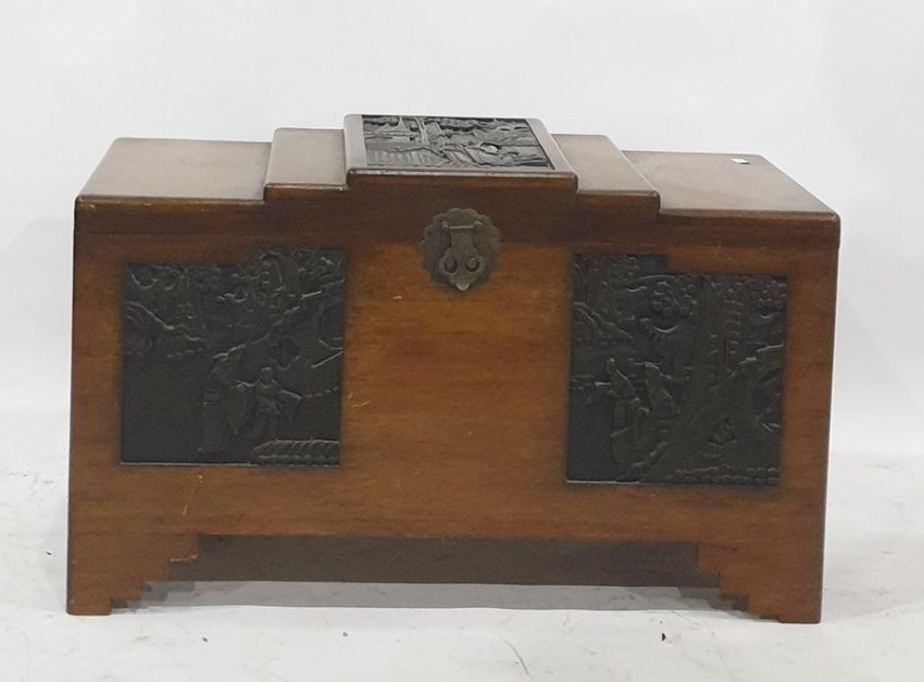 20th century Chinese camphorwood lined blanket chest, the stepped top with carved central panel, the whole raised upon bracket feet