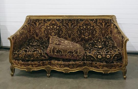 Late 19th/early 20th century gilt gesso three-piece suite viz:- three-seater settee with floral and swag carved toprail, scroll arms, similarly decorated frieze, on cabriole supports and a matching pair of tub armchairs, all upholstered in brown and beige foliate damask