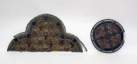 Triple arched lead lined and stained glass window panel decorated flower heads within trelliswork 46 x 25cm and another circular 22cm diameter (2)