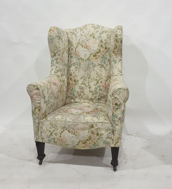 19th century wing back armchair in cream ground foliate patterned upholstery, raised on square section tapering supports to castors