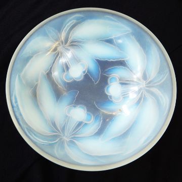 Art Deco opalescent glass bowl by G Vallon, moulded with bunches of cherries on three supports, marked G VALLON, 23.5cm diameter
