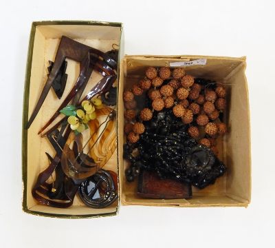 Assorted hat pins, faux pearls, carved jet necklace, carved nut necklace, various hair combs, buckles, etc (3 boxes)