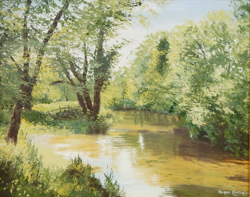 Valerie Chilton "Sun and Shadow sunlit woodland pool" signed and labelled verso, 39 x 49.5 cm