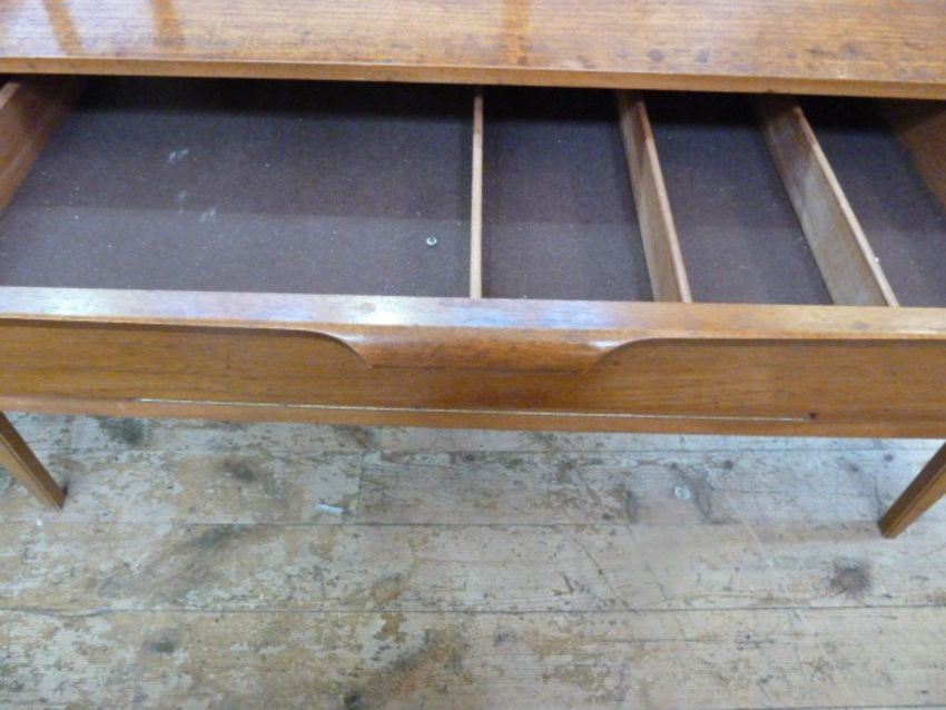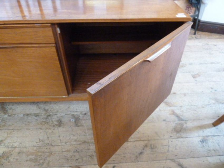 Austinsuite teak sideboard with central drawer and drop down cocktail cabinet, flanked by pair cupboards with scroll bar handles, on tapering supports, 180cm x 75cmCondition ReportOverall appears in fair condition, no obvious marks or burns. The top is a good colour. The drawers slide easily and cupboards fit. Please see images