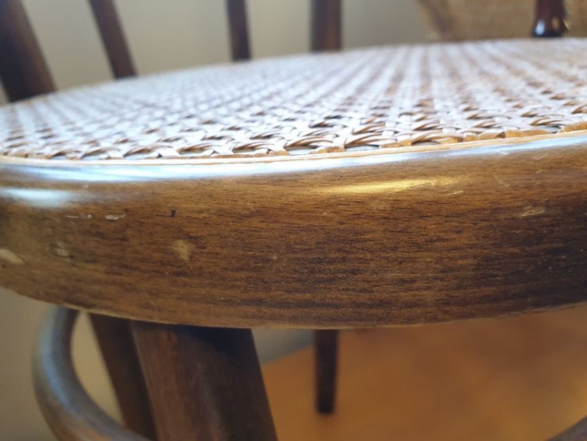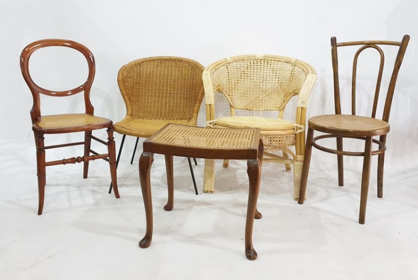 Four assorted chairs and a cane-seated stool raised upon cabriole supports (5) Condition ReportFor the chair on the right there are several grazes and scratches to the frame. Some of the screws have been attached at angles and thus have dug into the wood. One of the legs is slightly loose. See attached images