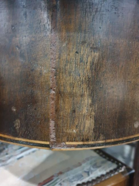 The length with the leaf is 203 cm, the length without is 125.5 cm approx. The width is approx 127 cm. The orginal picture is the table with the only leaf in it. There is a few large scratches on top and plenty of small ones. All 4 corners table appear to be shallowly cracked. The inlay along the bottom of the table top appears to be damaged in places. One of the legs has a large crack on the inside. See attached images.
