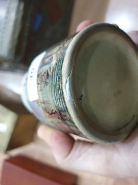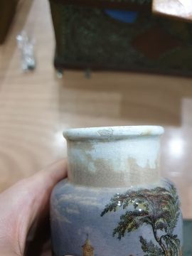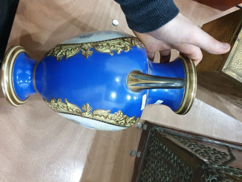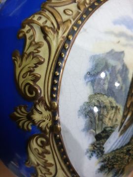 19th century Staffordshire pottery, Pratt-type, transfer-printed and enamelled two-handled blue ground vase, printed with birds of prey in rocky landscapes, within relief moulded scroll cartouches, with black loop handles, on a spreading foot, 29.2cm high and an inkpot printed and enamelled with a continuous Venetian landscape, 19.5cm high (2)  Condition Reportthe ink pot - Chips to the rim and the basethe vase - Spots of white paint, Repair done to the baseSee attached images