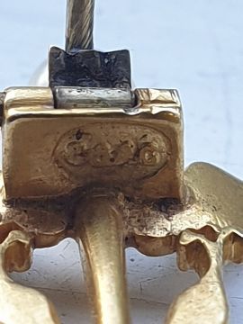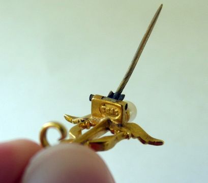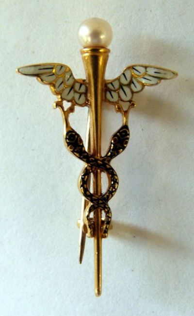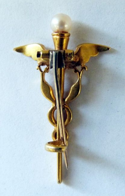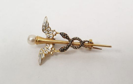 Carlo and Arthur Giuliano gold-coloured metal, pearl and enamel Caduceus brooch having pearl terminal, white enamel to the wings, black enamel to the two entwined serpents also having small stone set eyes, marked to the back of the clasp 'C&AG' (the Caduceus is the staff carried by Hermes, also a symbol of medicine) Condition ReportClasp in good condition and working order.Some flaking of black enamel on the right wing.Please see additional photos for the back and the mark.