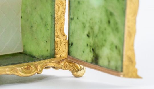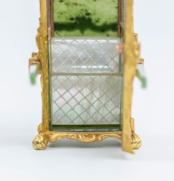 This is in good overall condition. There are remnants of old discoloured glue around the edge of the mother of pearl seat, where two pieces of mother of pearl join at the back of the seat. This may be original and has dried and discoloured over time. There are very small remnants of dried glue to the inner edge of the joining of the nephrite and gold at the opening of the door which are most likely original. One of the nephrite poles is loose and another has traces of glue around the join of the nephrite to the reeded gold pole although it does not appear to have been cracked. The nephrite and rock crystal panels are in good order. The wooden box has some surface scratching, some tearing to the silk lining at the hinge and some typical discolouration to the velvet where the chair sits. 3 tiny holes in goldwork at the top of carriage on the left hand side when facing. TIny scratches to the windows. Chip to the Nephrite, at the base, in one corner.