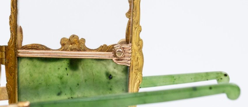Fabergé nephrite, rock crystal, mother-of-pearl and vari-colour gold miniature model of a sedan chair, marked with the Kokoshnik and 56 to one foot and workmaster’s initials M.N for Mikhail Perchin, St. Petersburg, to another foot, scratched inventory number 5885 at base, circa 1899-1903, with import marks for George Stockwell, London, 1928 to one gold side panel below window. The rocaille vari-colour gold frame chased with scrolls to the interior, mounted with six rich green nephrite panels, the rock crystal windows engraved with simulated swagged and tasselled curtains, the hinged door with functioning handle revealing a mother-of-pearl seat to the interior, each side with two chased gold hinged brackets supporting a reeded gold and nephrite pole, in a velvet and satin-lined Fabergé wooden case