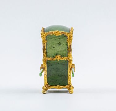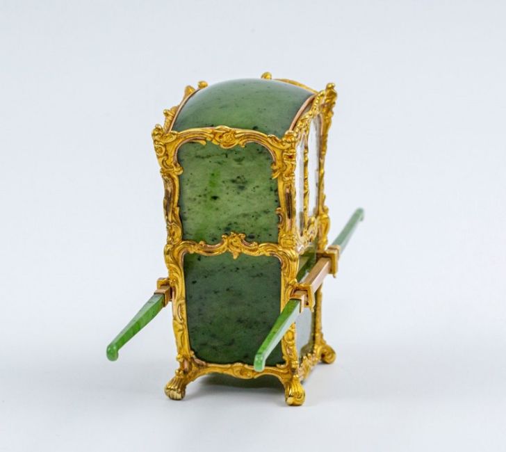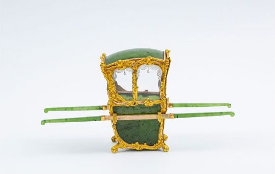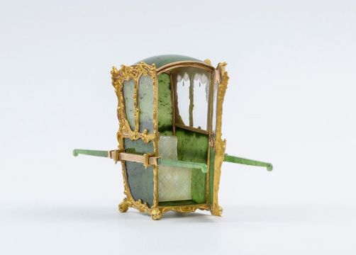 Acquired by Mr. K.W. Woollcombe-Boyce on 9 October 1929 from Wartski for £75 and thence by descent to the present owner. Recorded in two family inventories, the first inscribed: ‘Tortoiseshell, Ivory, Coral, Jade etc, 9.10.29: Jade, gold & crystal miniature sedan-chair with poles, maker Fabergé, from the Russian Imperial Collection at the Hermitage - Wartski, London £75’. The second inventory inscribed: ‘Objects in the Possession of Mr. K.W. Woollcombe-Boyce (and Daughter), made in the Workshop of Peter Carl Fabergé, in St. Petersburg, Moscow Or Odessa between 1841-1918’: ‘Item 1: A Sedan chair with moveable poles, made of Jadeite, mother-of-pearl (seat), crystal (windows) & gold, height 3’’ overall length 6’’. Stamped with gold mark on underside of bottom of one foot and under second foot, Wkmaster M. Perchin. Bought in 1929 from Wartski for £75. In original white-wood case from the Russian Imperial Collection at the Hermitage…’