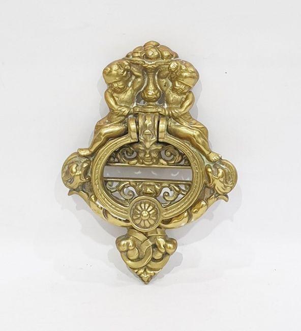 A brass door knocker cast as two putti seated above scroll work supporting a vase of fruit, the door knocker formed as a mask suspending a oval ring, 26 cm high.