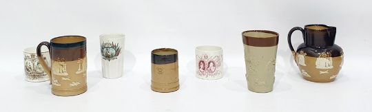 Royal Doulton stoneware harvest jug, 15cm high, a tapering mug similar, four Royal Copenhagen white biscuit Neo Classical plaques, three commemorative mugs and a stoneware half-pint mug (10)