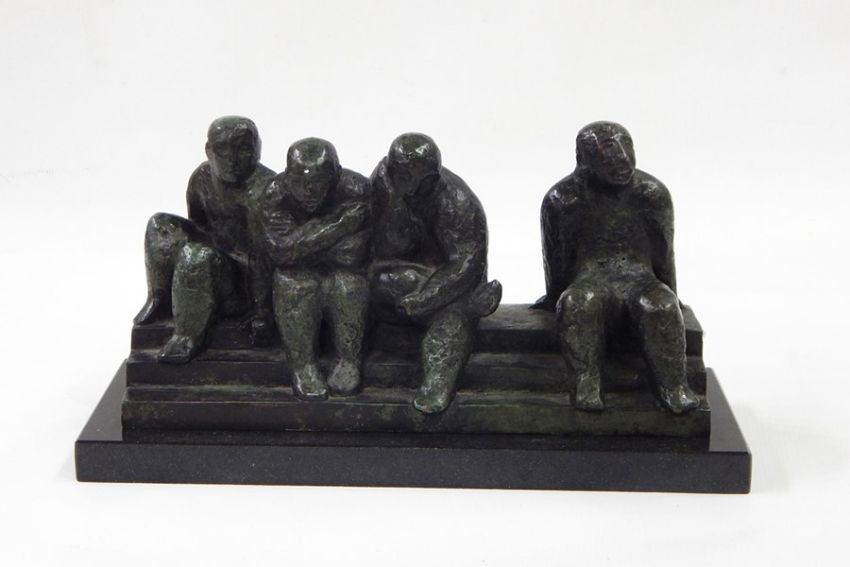 Florian Wozniak (b.1962) bronze "Waiting", study of figures upon steps, 17cm