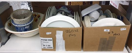 Two boxes of mainly white ceramics to include plates, toast rack, coffee jug, teapot, a large wash bowl and two planters