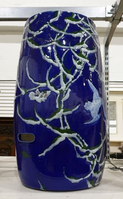 Three boxes of assorted glassware including vases, decanters, brandy balloons, plus Chinese style blue ceramic stool with stork decoration etc