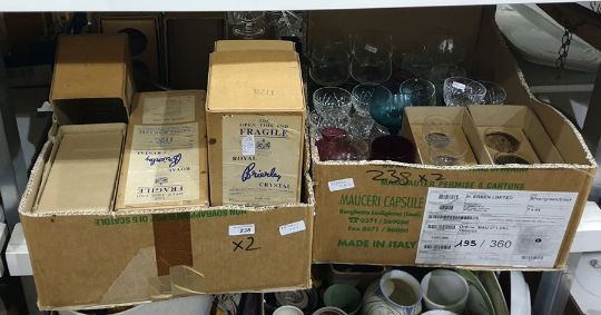Two boxes of vintage glassware including boxed Royal Brierley crystal and other coloured glass and decanters