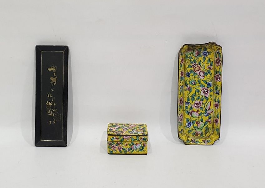 Canton enamel yellow ground part desk-set comprising a shaped rectangular tray and a rectangular box and cover, painted with pink flowers, butterflies and green leaves, 22cm wide and a Chinese lacquer rectangular section pen tray, gilt with a bird on a branch (3)