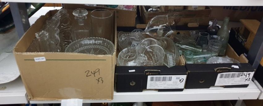 Three boxes of mixed glassware to include fruit bowls, decanter, large wine glasses and some vintage bottles
