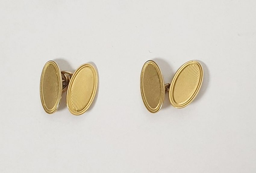 Pair of 18ct gold cufflinks, straight engraved decoration, 6.6g