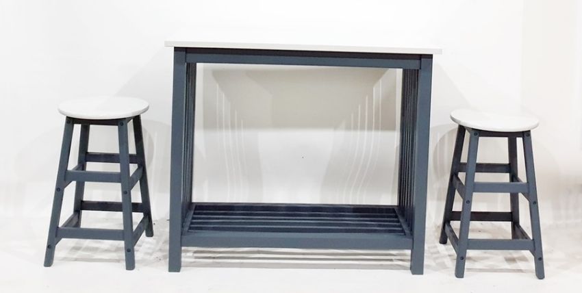 Twentieth century grey and white painted breakfast bar with two stools, fitted below  107 x  92 cms