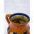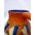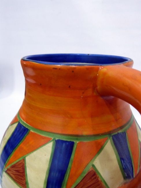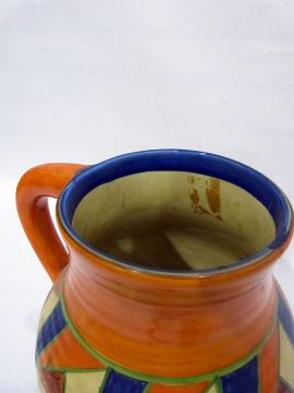 Clarice Cliff 'Bizarre' Ware lotus shaped jug, circa 1930, printed gilt and impressed marks, painted in shades of orange, blue, green and brown, with geometric Art Deco style shapes, 30cm high (crack to rim) Condition ReportHairline crack to rim, approx 5m long. Discoloured mark inside rim and change in colour area to the neck.
