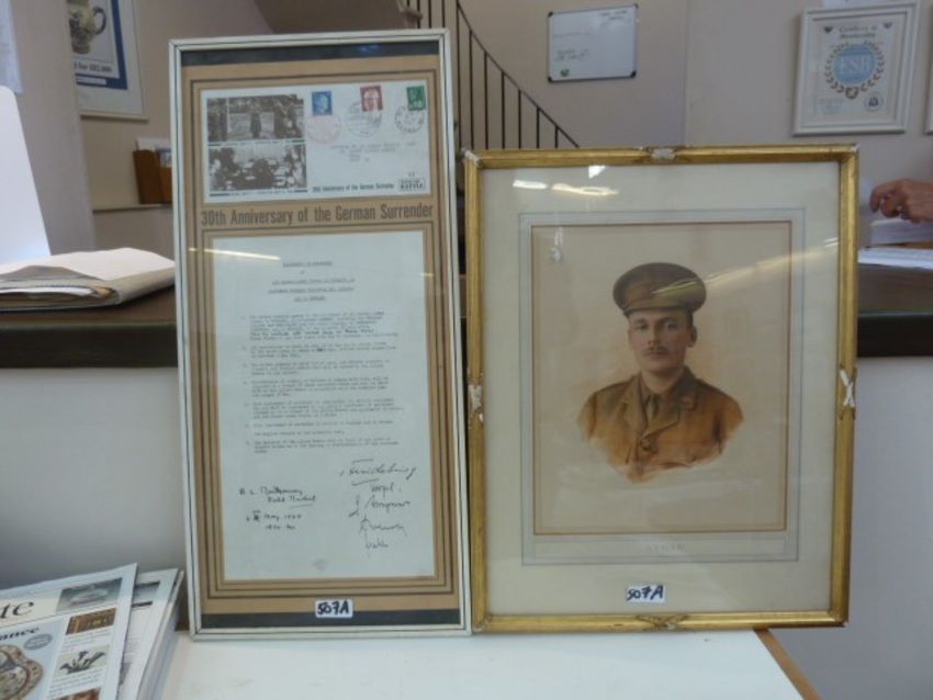 Copy of The German Surrender 1945 with 30th anniversary First Day Cover, framed,
