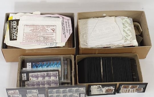 Box of GB used on about 50 stock cards including high value castles and three boxes of miscellaneous storage bags, approval books, some stamps and cards (4 boxes)
