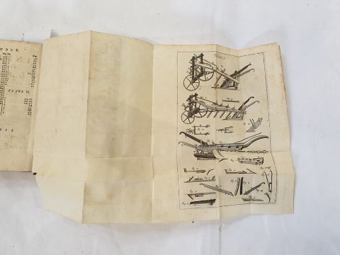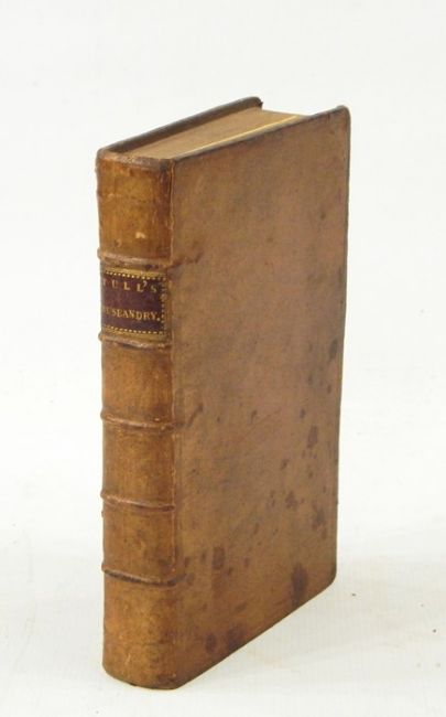 TULL (Jethro) Esq 'The Horse Hoeing Husbandry. or an Essay on the Tillage and Vegetation...by the use of Instruments described in CUTS ' Dublin, printed by  A  Rhames in 1733, inscription top of title page, engraved vignette of ploughing, engraved heading the preface, chapter header to the preface, folding plates, full leather, paste down, gilt titles and raised bands,  ( not fully collated)