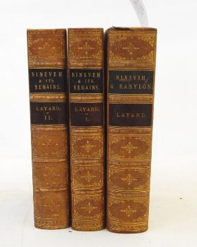 Layard, Austen H "Discoveries in the Ruins of Nineveh and Babylon ...", John Murray 1853, folding frontis, plates (some folding), ills throughout, folding plan of Kouyunjik, etc, all marbled edges, marbled boards, half leather with pastedowns, gilt titles and raised bandsLayard, Austen Henry"Nineveh and its Remains ...", John Murray 1949, two vols bound uniform with previous, plates, ills, folding plates and plans, marbled ep, all marbled edges, marbled boards and half leather (3)