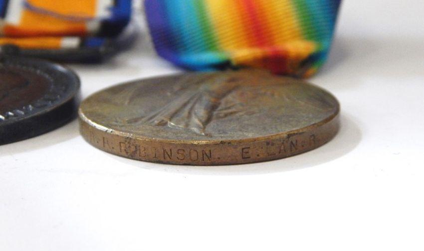 WWI War Medal and Victory medal named to " 8167. PTE. R.P. Robinson. W. LAN. R." Private Robinson was killed in action 15 June 1915