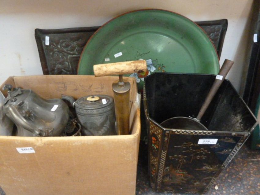 An Arts and Crafts copper rectangular tray, decorated with scrolling foliage and flowers, 59 x 40cm, together with a copper green painted circular tray, a metal lacquer style square section waste paper basket, two Victorian metal teapots and other items of metalware