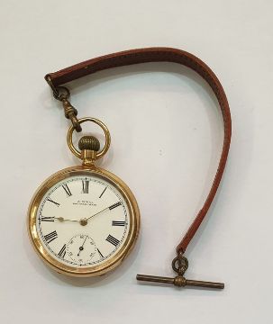 Gold-plated Waltham pocket watch, button winding with subsidiary seconds dial