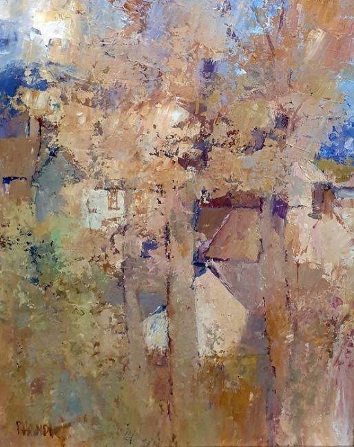 Roy HewishOil on canvas Houses through trees, France, signed lower left, 36cm x 28cm (framed)