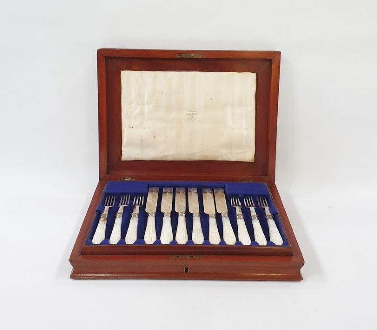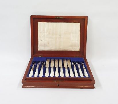 Mother-of-pearl handled fruit knives with silver-plated and engraved forks and knives, place setting for 12, in fitted box marked 'Mappin & Webb"Condition ReportNo visible chips or cracks in any of the handles