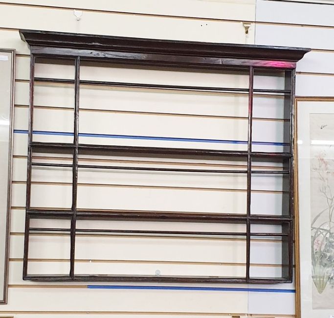 19th century Scottish oak wall-hanging plate rack with ogee moulded pediment above the three enclosed shelves