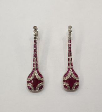Pair of Art Deco style platinum, ruby and diamond pendant drop earrings, each with four collet set diamonds above tapered column, with shaped rectangular panel, each with large oval cut ruby and smaller calibre cut rubies