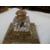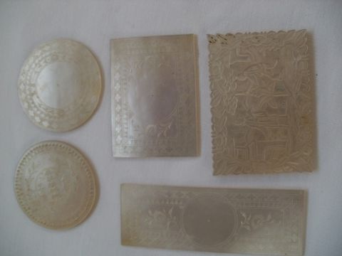 Glass and brass inkstand, the brass stand with cut foliate design, square with the fitted inkwell with brass lid and mounts, a brass rectangular pot with Chinese characters to the base, a silver-plated three-tiered trinket box with figures, mother-of-pearl game counters, a coloured photograph of a child within a brass frame and a vintage folding handbag mirror Condition Report-