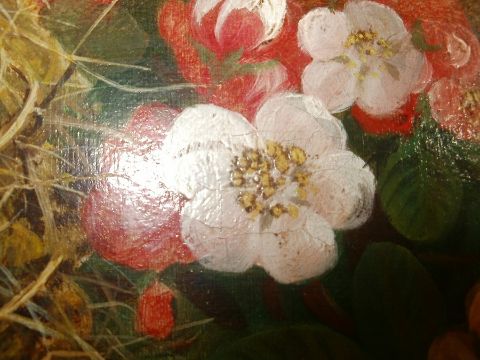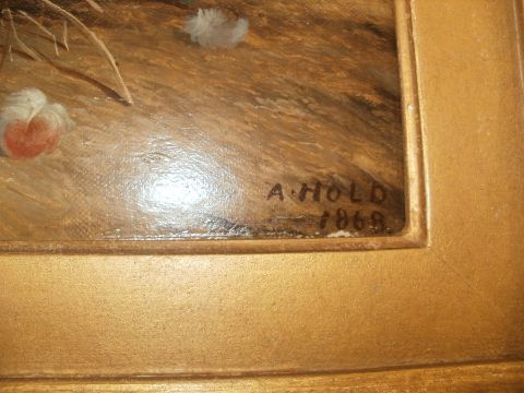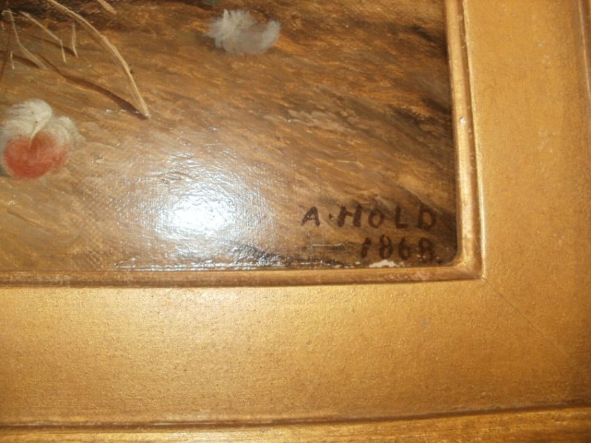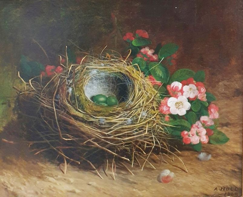 Abel Hold (1815-1891)Oil on boardStudy of birds' nests with eggs and pink blossom, signed and dated 1868, 24cm x 29cm (framed)Condition ReportDamage to top of frame (approx. 0.5cm).  No other damage on frame noted.  Slight 'cracking' on section of painting (see attached image).