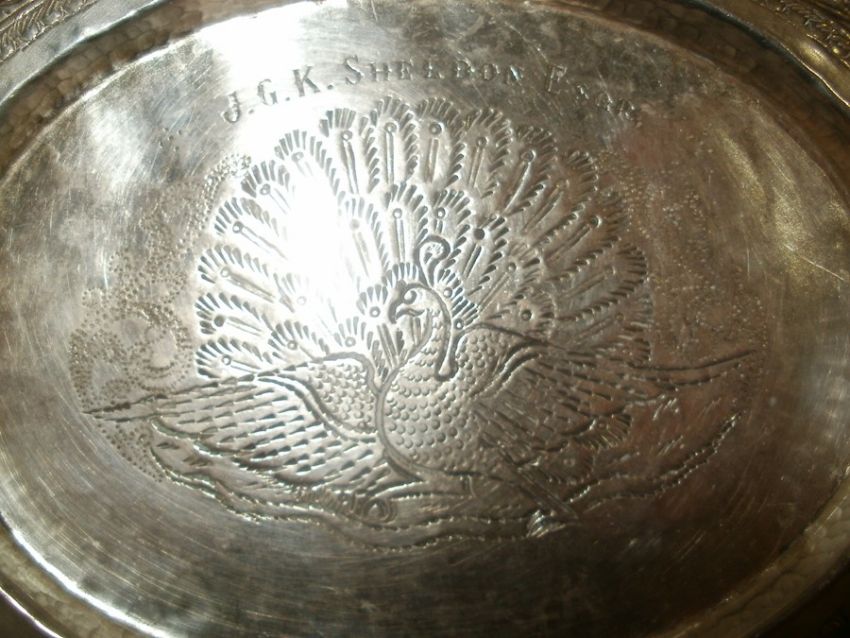 Three Eastern white metal small bowls, animal and scroll decorated, possibly Indian, two foreign white metal pierced trinket dishes and a white metal foreign oval tray, peacock decorated (6) Condition Report.