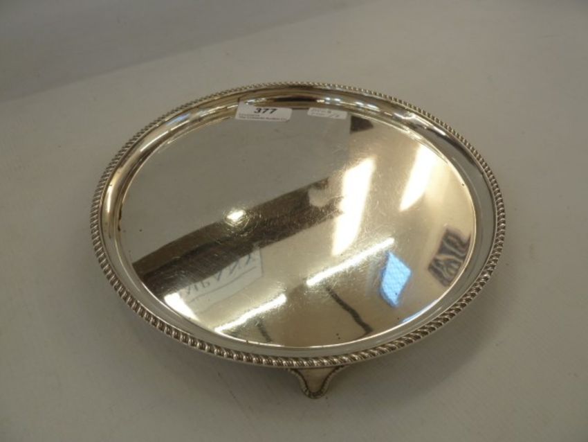 Silver circular presentation card tray with gadrooned border, raised on splayed feet, Birmingham 1940, weight 12oz approx, dia. 20.5cm