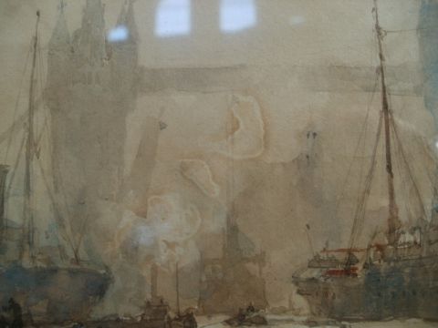 Charles Edward Dixon (1872-1934)Watercolour drawing Pool of London with shipping and Tower Bridge in background, signed lower left, 23cm x 35.5cm (framed and glazed with a gilt mount)Condition ReportOn back of frame, brown backing paper ripped; wooden panels beneath appear to be intact.  Minimal amount of cracking noted on frame (bottom left).  Small mark just above centre of painting and three more on right hand-side