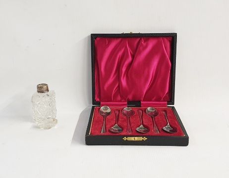 Set of six silver coffee spoons, Sheffield 1927, in fitted case and a cut glass dressing table bottle with silver mounts