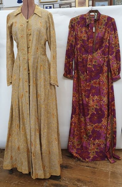 Indian full-length linen embroidered housecoat,  with the pine cone design, fabric covered buttons all the way down the front, full skirted and a silk coat -dress with belt (2) Size 12-14